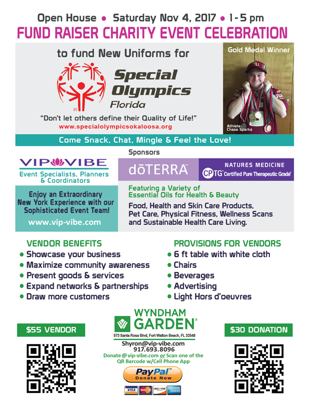Showcase your Wellness Advocate skills and special essential oil talent/s at this event for a nominal registration fee of $55 - to cover expenses. Do not hesitate to be are part of this exciting celebration. We can only accommodate 14 tables/vendor spots at this event. Proceeds go to fund New Uniforms for our local Okaloosa Special Olympics Team. Please click on the button to reserve your table today: